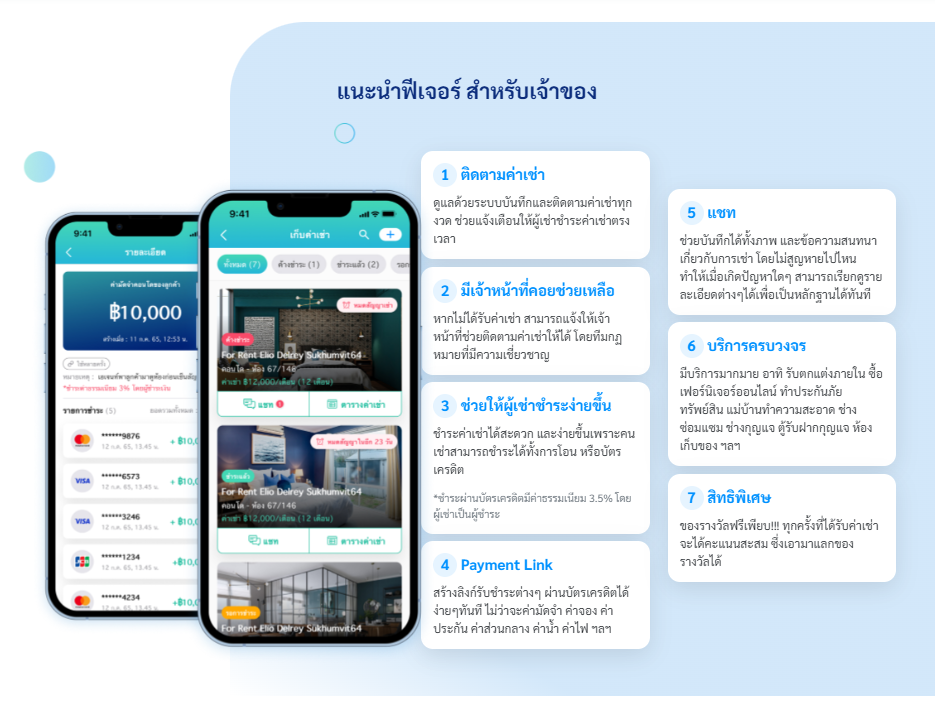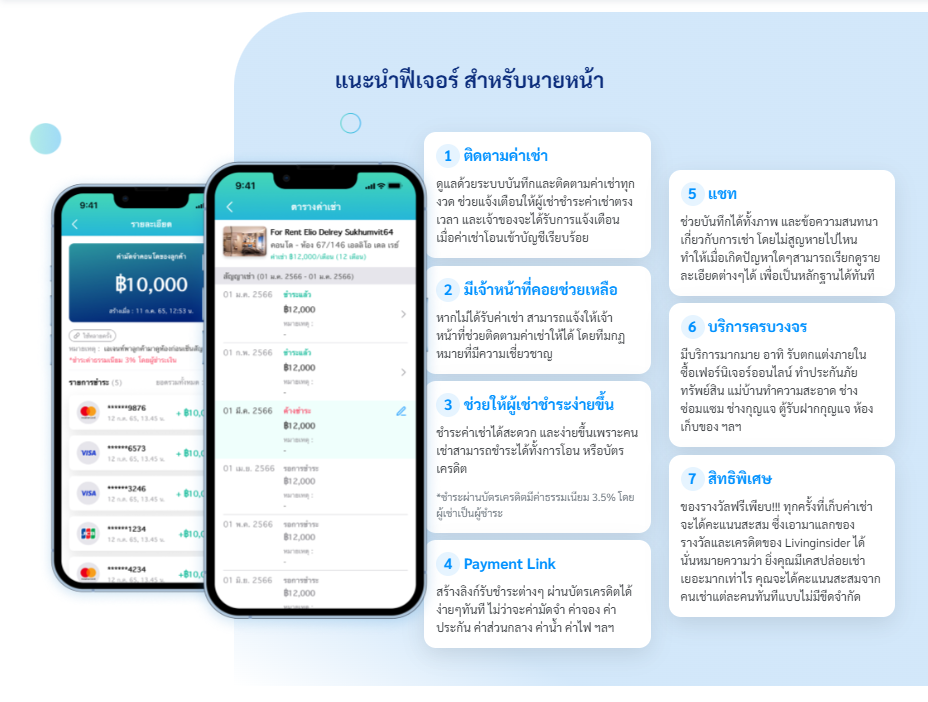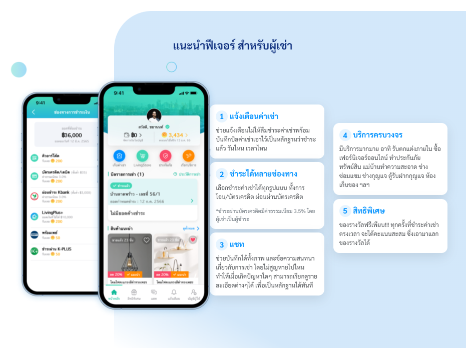 นอกจากใช้คะแนนแลกรางวัลกันได้แล้ว LivingPlus+ ยังมีฟีเจอร์เจ๋งๆที่คอยช่วยเก็บค่าเช่า ช่วยบันทึกเเละติดตาม เเละยังเป็นตัวกลางในการจ่ายค่าเช่าได้อีกด้วยบัตรเครดิตหรือแบบผ่อนชำระได้อีก มาดูกันเลย เราทำอะไรได้บ้าง