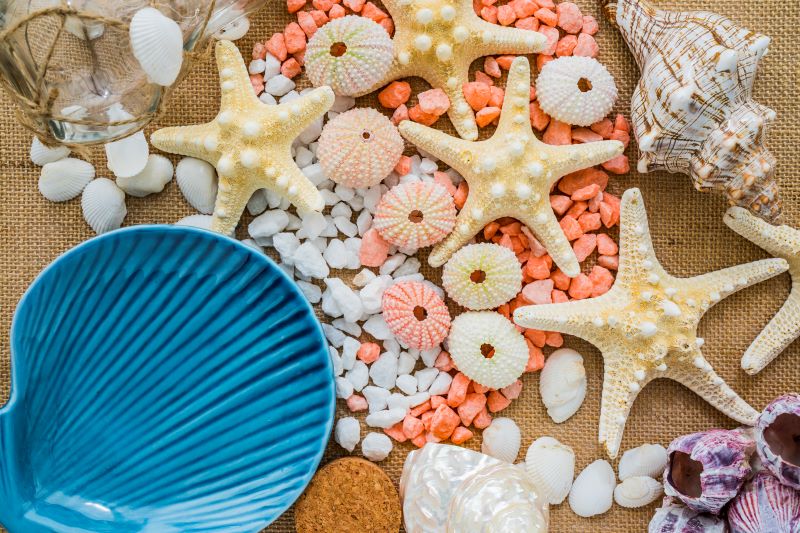 การใช้เปลือกหอยตกแต่งบ้านเพื่อสร้างบรรยากาศของทะเลเป็นไอเดียที่น่าสนใจไม่น้อย เพียงใช้เฟอร์นิเจอร์หรือของตกแต่งที่มีเปลือกหอยเป็นวัสดุหลัก ก็ช่วยให้บ้านเหมือนอยู่ริมชายหาดแล้ว ยกตัวอย่างเช่น โต๊ะกาแฟที่มีพื้นผิวเป็นเปลือกหอย ประดับบ้านด้วยโมบายเปลือกหอย ติดภาพวิวทิวทัศน์ของทะเลที่ผนังโดยใช้กรอบที่ทำจากเปลือกหอย หรือถ้าใครไม่อยากใช้เปลือกหอยจริง ๆ ก็อาจตั้งโคมไฟรูปหอยแทนก็ได้เหมือนกันค่ะ