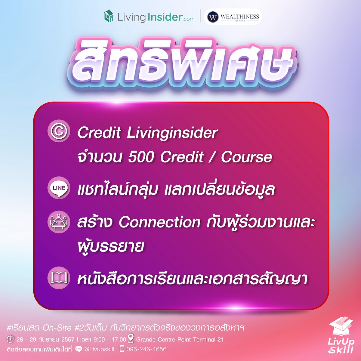 (ใครที่ซื้อคอร์ส 2 วันเต็ม รับไปเลย 1,000 Credit) เอาไว้ใช้ดันประกาศขาย/เช่า ที่Livinginsider ให้ลูกค้าเห็นประกาศของคุณก่อนใคร!