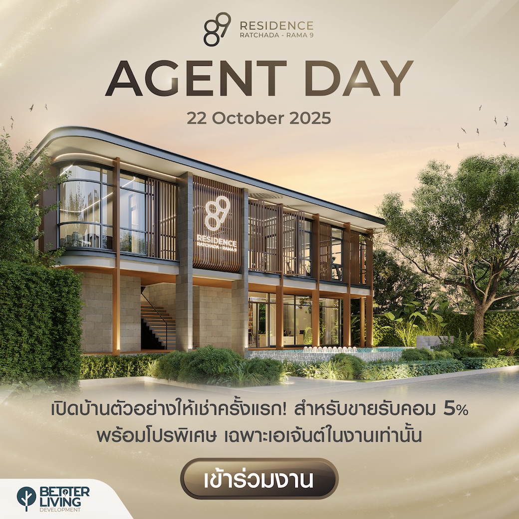 ขอเรียนเชิญคุณเข้าร่วมงาน Agent Day รอบพิเศษ Agent Day 89 Residence – เปิดบ้านตัวอย่างให้เช่าครั้งแรก! สำหรับขายรับคอม 5% พร้อมโปรราคาพิเศษเฉพาะเอเจนต์ในงานเท่านั้น