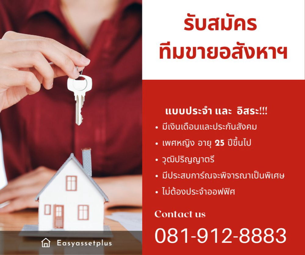 สนใจร่วมงานกับ RE/MAX Easyassetplus ส่งจดหมายสมัครงาน หรือติดต่อสอบถามรายละเอียดเพิ่มเติมได้ที่ 081-912-8883 บริษัท อีซี่แอสเซท พลัส จำกัด Easyassetplus Company Limited