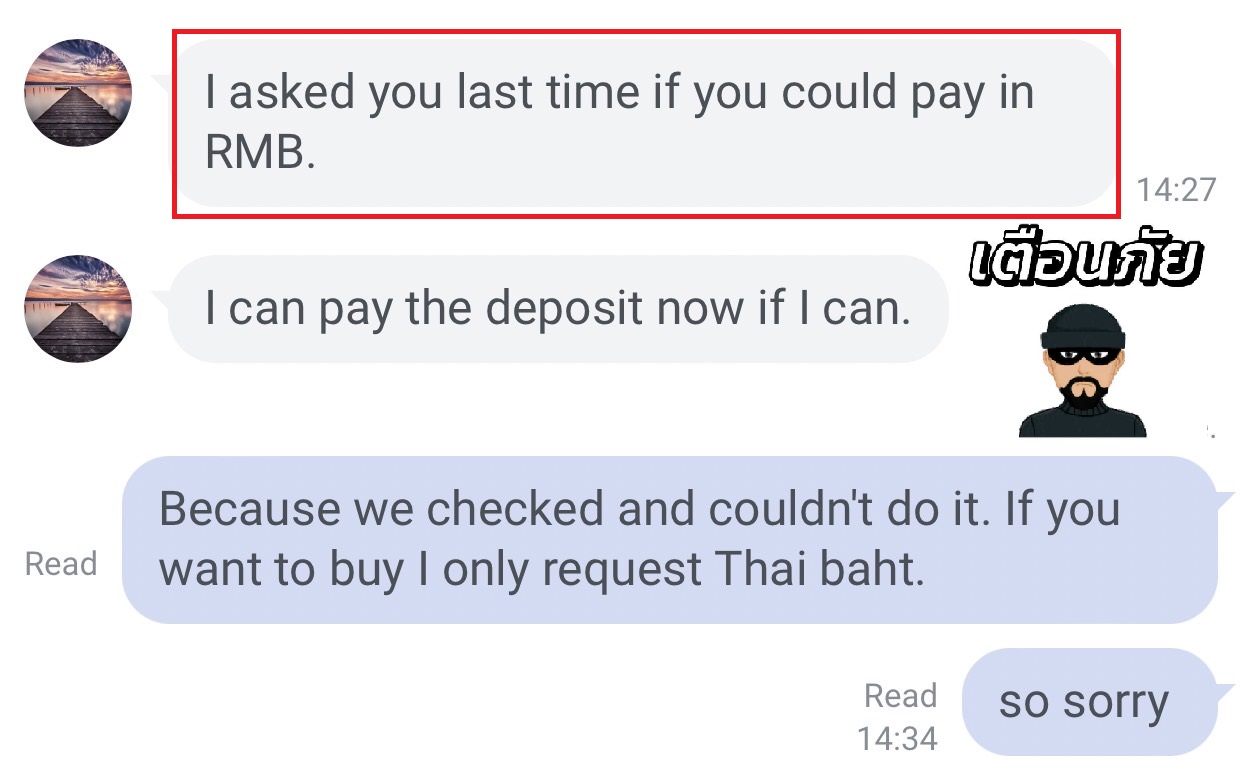 🚨 แจ้งเตือนสมาชิกทุกท่าน ระวังมิจฉาชีพ ….. could pay in RMB ? หากต่างชาติถามมาแบบนี้ บอกเลยว่า มิจฉาชีพเกือบ 100%