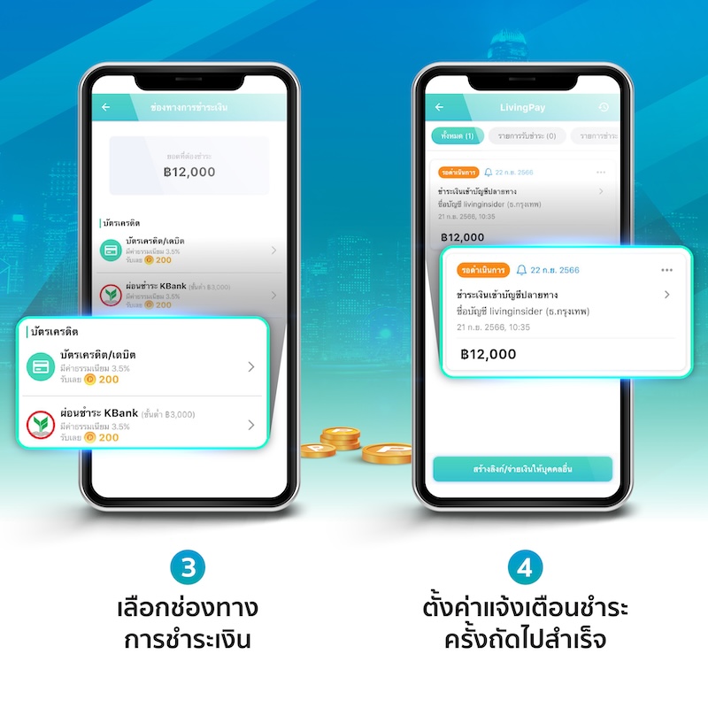 ที่พิเศษคือ เมื่อแจ้งเตือนแล้ว หากงวดนั้นๆ ไม่ต้องการใช้เงินสด ก็สามารถชำระค่าเช่าผ่านบัตรเครดิตหรือแบบผ่อนจ่ายกับธนาคารกสิกรได้ทันทีเลย
