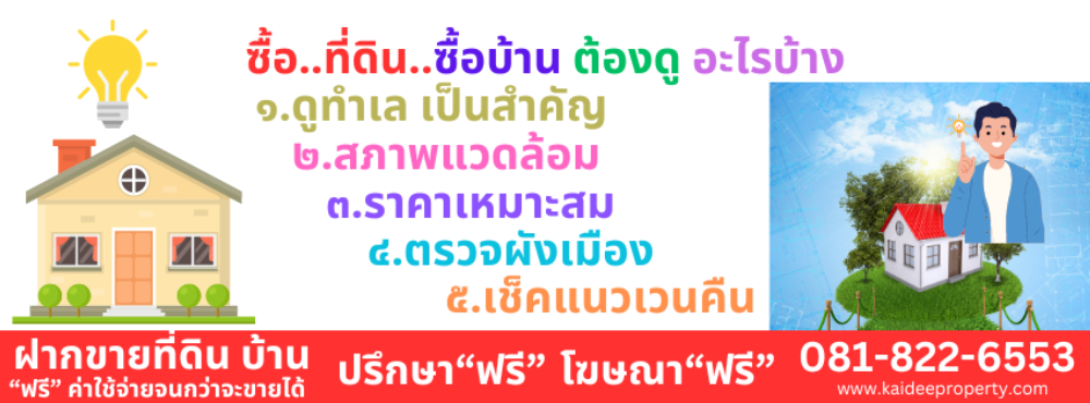 ฝากขายที่ดิน บ้าน “ฟรี” ค่าใช้จ่ายจนกว่าจะขายได้ พร้อมทั้งทำเรื่องยื่นกู้สินเชื่อ จนถึงโอนกรรมสิทธิ์ ณ สำนักงานที่ดิน โทร.081-822-6553 www.kaideeproperty.com