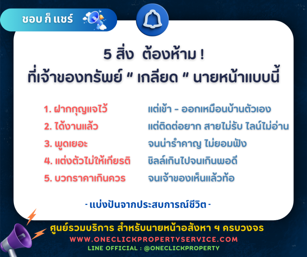 5 สิ่งที่ต้องห้ามทำ สำหรับนายหน้า ถ้าไม่อยากให้เจ้าของทรัพย์ เกลียดคุณ ! แชร์จากประสบการณ์ ที่ผ่านพบกว่า 10 ปี