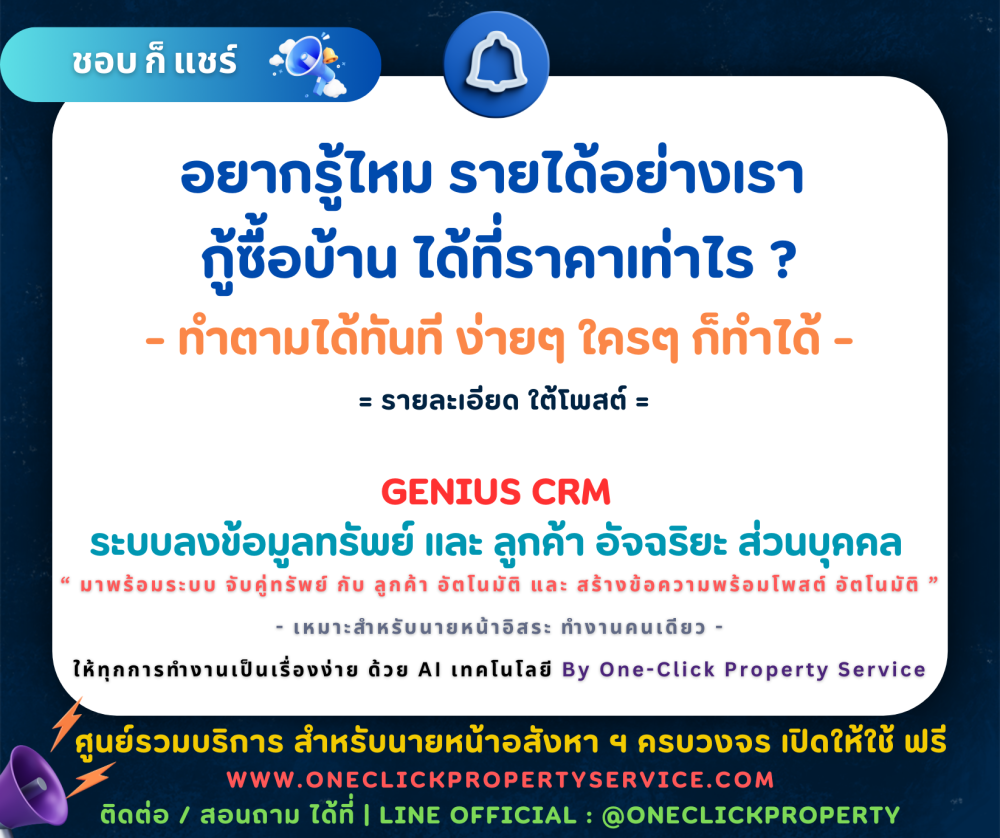 One-Click Property Service ศูนย์รวมบริการ ผสาน Ai แบบ ครบวงจร สำหรับนายหน้าอสังหา ฯ ติดต่อสอบถามได้ที่ Line ID = @oneclickproperty