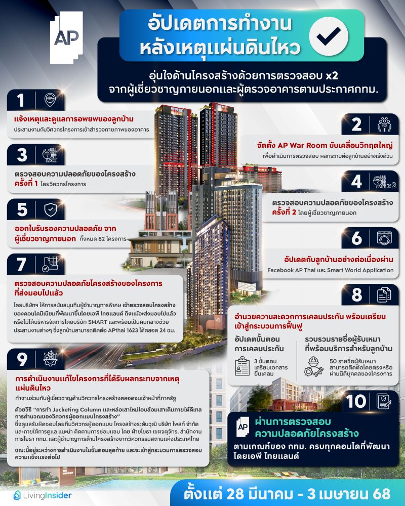 𝘼𝙋 𝙏𝙝𝙖𝙞𝙡𝙖𝙣𝙙 ส่งผู้เชี่ยวชาญตรวจสอบโครงสร้างอาคารครอบคลุม 𝟴𝟮 โครงการ หลังแผ่นดินไหว เพื่อสร้างความมั่นใจให้กับลูกบ้าน