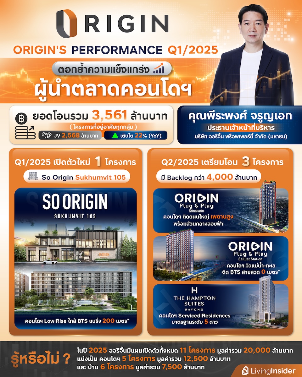 ออริจิ้น พร็อพเพอร์ตี้ เผยผลประกอบการ Q1/68 ตอกย้ำความแข็งแกร่ง ผู้นำตลาดคอนโดมิเนียม